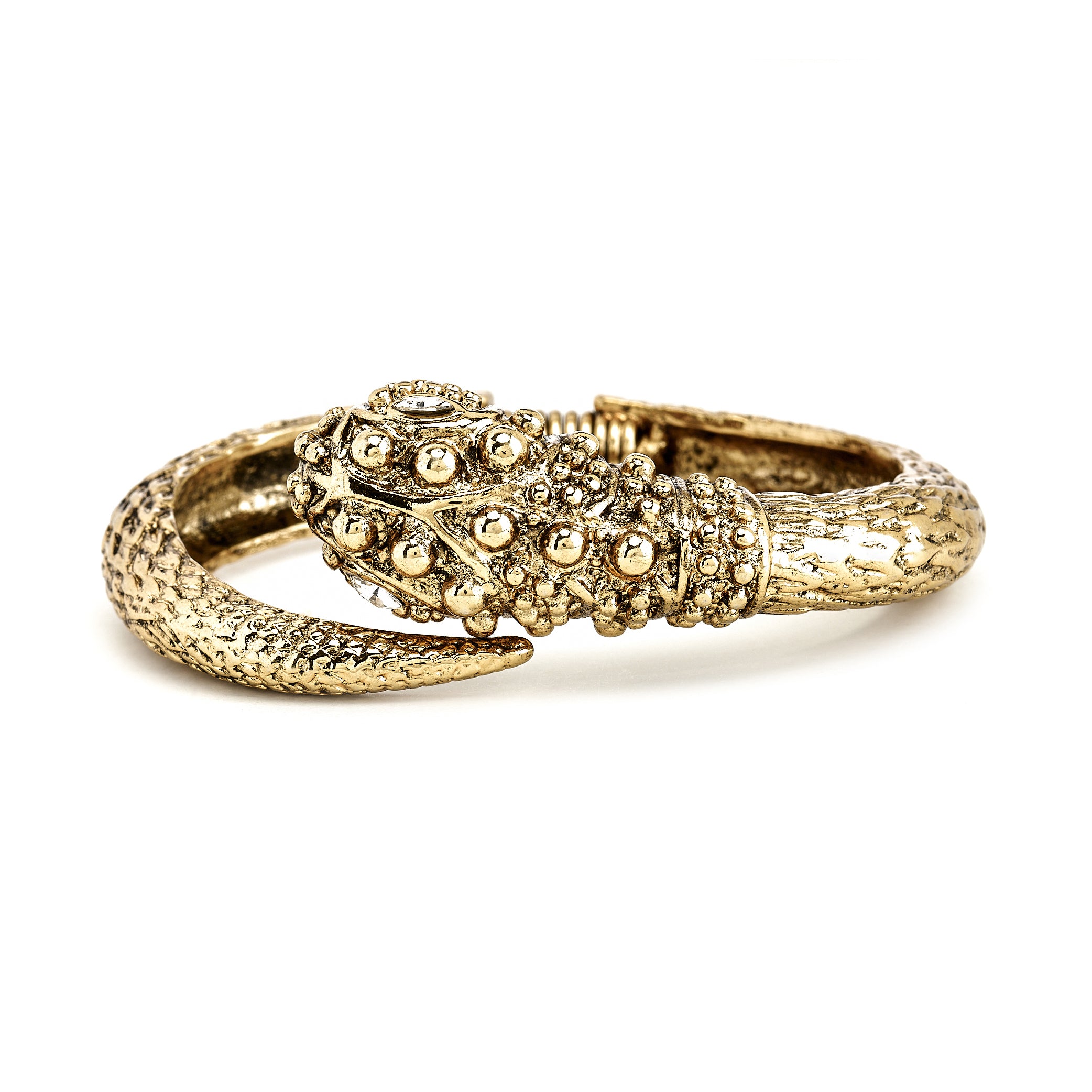 Our gold-plated snake head bracelet will turn heads on your wrist. Slides on with a spring and sparkles with glass crystal eyes.