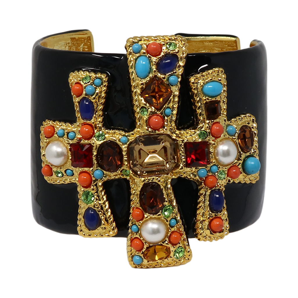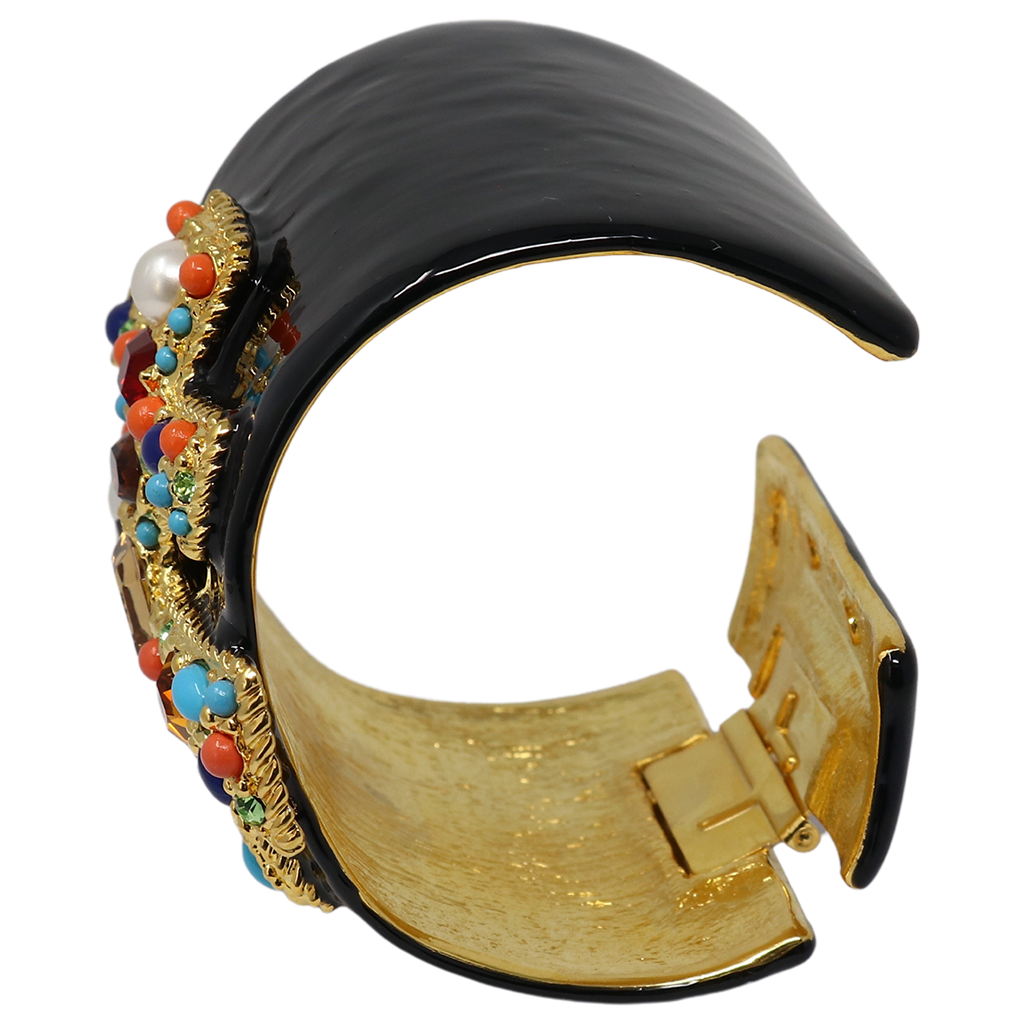 This stunning, USA-made Kenneth Jay Lane cuff is 22-karat gold plated with black enamel coating and bedazzled with multicolored gemstones and faux pearls. With a decades-old history, the design of this statement piece is simply timeless.