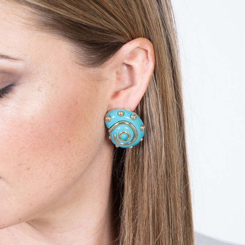 This signature Kenneth Lane clip-on earring is a beautiful take on a snail shell, comprised of turquoise resin with gold-plating and a faux pearl center.