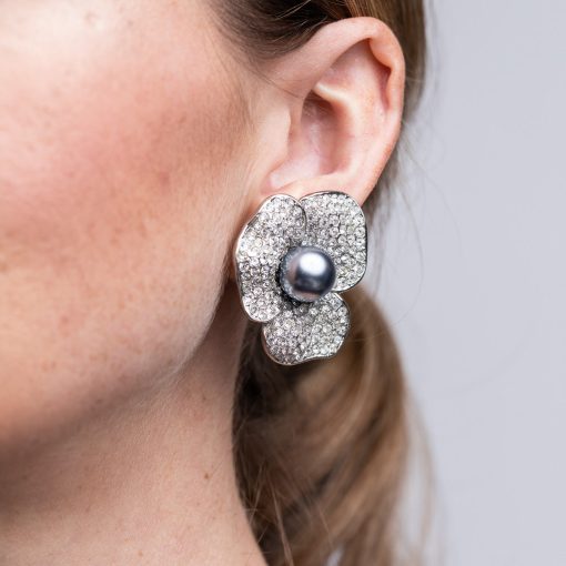 Rhodium-plated flower clip-on earring adorned with small rhinestones and a beautiful, 10 millimeter grey pearl center.