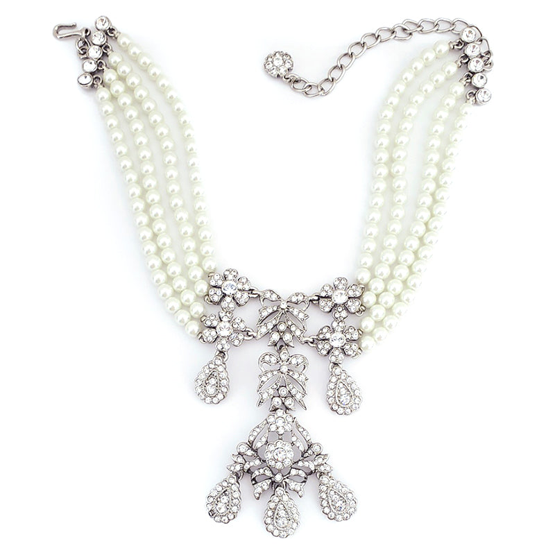 An 18th century-inspired design, this four-row, glass pearl choker necklace with a stunning antique silver & rhinestone bow drop pendant is from Kenneth Lane’s famous “Let Them Eat Cake” Collection.