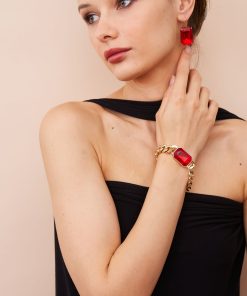Bold and elegant, this adjustable gold chain bracelet showcases a radiant ruby octagon stone and a sleek toggle clasp for a refined finish.