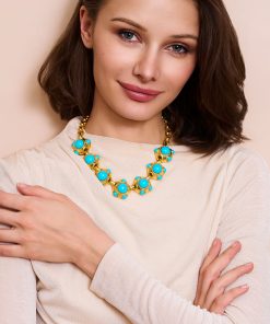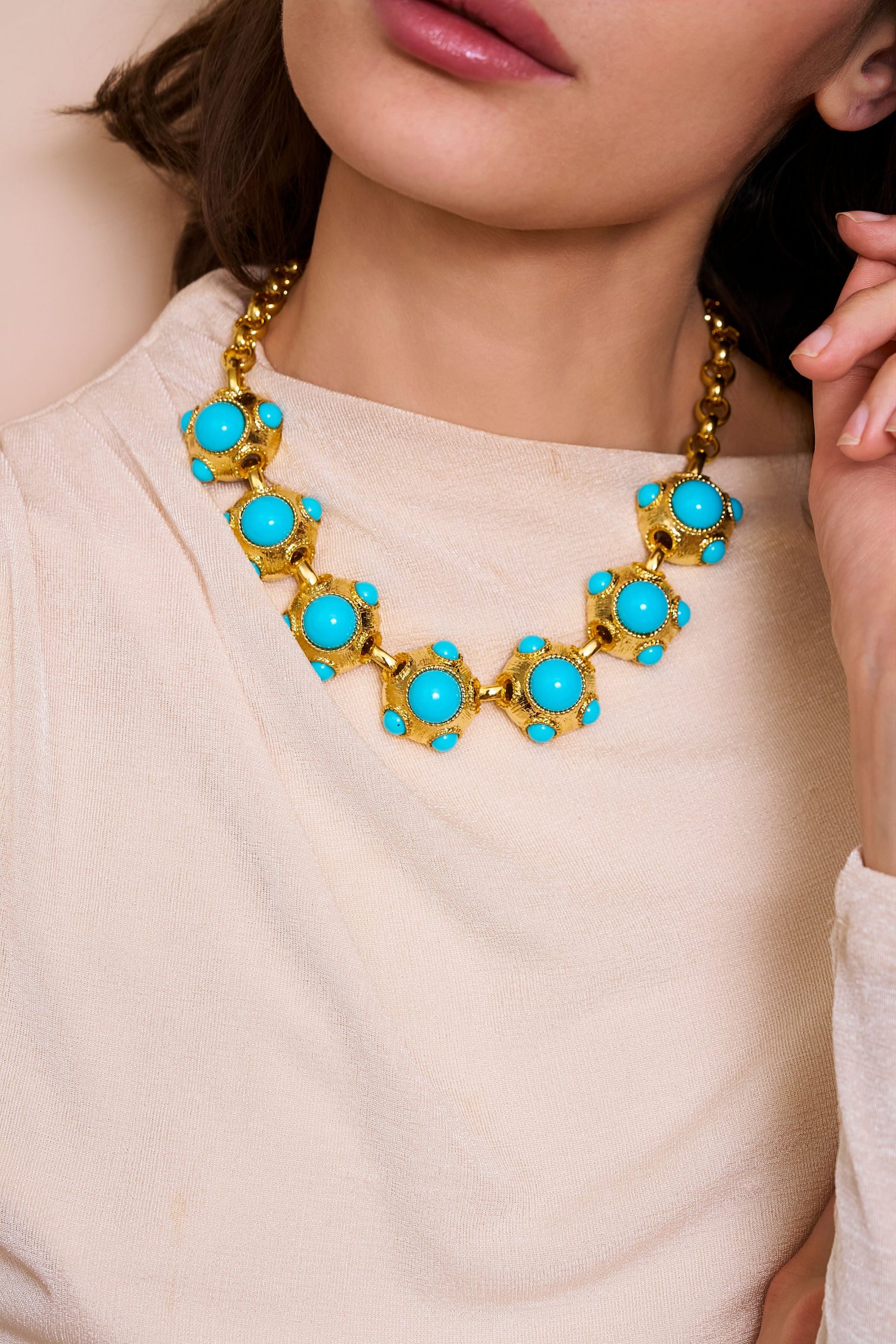 The lustrous satin gold finish exudes understated luxury, while the vibrant turquoise center adds a pop of color and visual interest. The combination of textures and hues creates a harmonious and captivating aesthetic that is sure to turn heads.