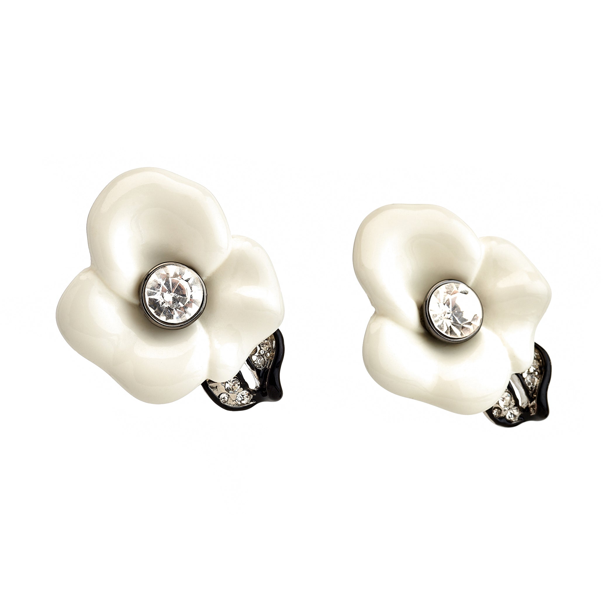 Elegant and eye-catching, these white flower clip-on earrings feature silver and crystal black lines with a delicate leaf design for a sophisticated finish.